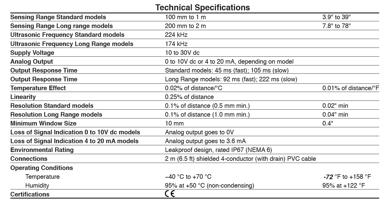 The Double E Group Ultrasonic Diameter Sensor uses sound waves to measure distance from the sensor to the roll of material. Distance is calculated by measuring the time it takes for the sensor to emit the sound wave and then receive it back after it has been reflected off the outer surface of the roll. The measured distance is then scaled to match an analog output signal, either 0-10V or 4-20mA depending on the model of sensor. This sensor is excellent for use in open-loop unwind tension control applications, soft loop unwind applications and for inertia compensation calculation on advanced roll unwind and winding applications.